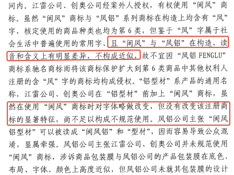 原审法院与再审法院对本案争议焦点的审查思路及认定结果截然不同。再审法院首先审查被诉商标与权利商标的核准使用商品,二者核定使用于相同商品品类;其次,被诉侵权标识“闽凤铝型材”和“闽凤铝材”标识,用于产品包装膜上,系识别商品来源的商标性使用;再者,被诉“闽凤”商标改变字体且与“铝型材”、“铝材”相同的字体一并使用,属于不规范使用(与原审对不规范使用的审查标准明显不同);值得注意的是本案之所以要认定被诉侵权商标属于不规范使用,是法院管辖的需要,根据法律及相关司法解释规定,规范使用的商标之间的纠纷应当提交商标局裁定,不属于法院的管辖范围(驰名商标除外)。最后,法院根据二者的比对,认为“闽凤”商标的显著部分在于“凤”,该显著识别部分与权利商标“凤铝”的主要认读“凤”相同,因此二者构成商标近似。被诉侵权商标用在铝型材上,容易造成相关公众对该商品的来源产生误解,从而认为该商品源于再审申请人凤铝公司。